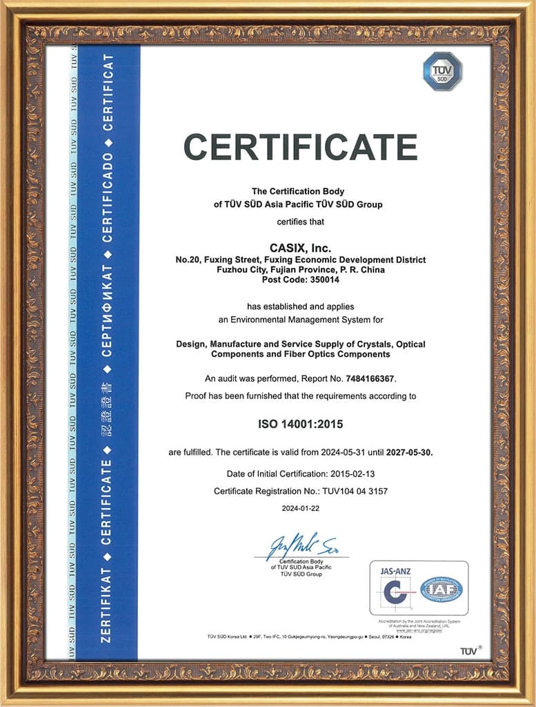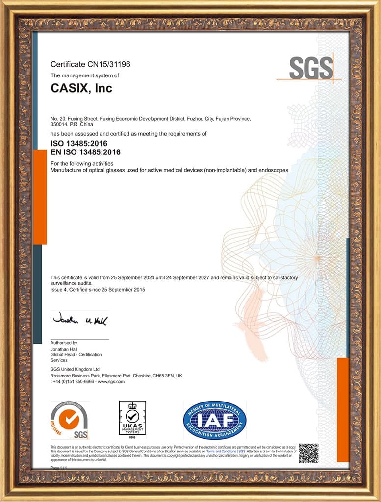 Casix Inc., founded in September 1992, are recognised as a leading manufacturer of precision optics for applications in automotive, biomedical, telecom, laser and instrumentation. By adhering to the spirit of "safety, unity, dedication, innovation and excellence" together with international advanced management philosophies, over 1400 employees are dedicating to satisfying the needs of our customers and target markets in terms of performance and cost effectiveness.