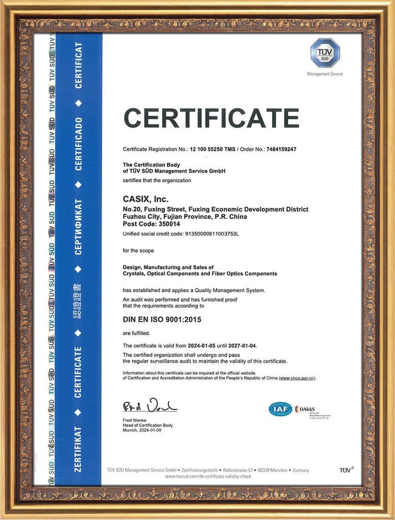 Casix Inc., founded in September 1992, are recognised as a leading manufacturer of precision optics for applications in automotive, biomedical, telecom, laser and instrumentation. By adhering to the spirit of "safety, unity, dedication, innovation and excellence" together with international advanced management philosophies, over 1400 employees are dedicating to satisfying the needs of our customers and target markets in terms of performance and cost effectiveness.